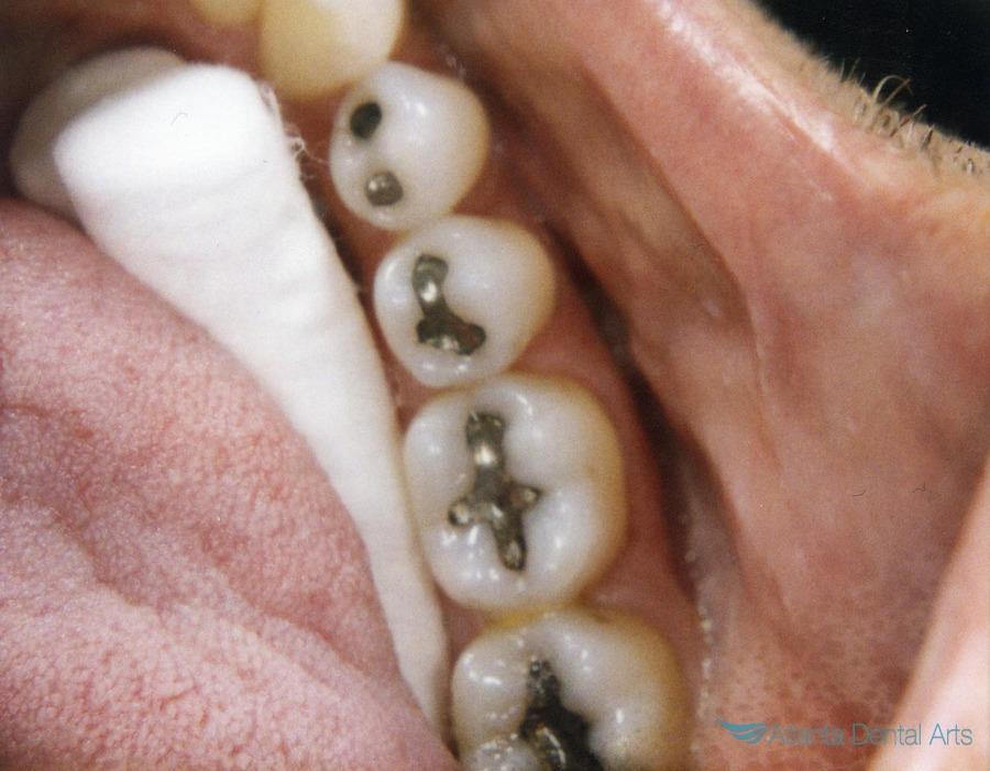 Posterior composite fillings( white fillings on back teeth) The same type of filling material used to do bondings and fillings on front teeth can be used to fill back teeth. Traditionally, Amalgam fillings were considered the only choice for fillings on back teeth. These fillings are the greyish fillings you see in other people’s mouths, or may have in your own. They are made primarily of mercury and silver. Now, many dentists like myself use tooth colored or composite fillings, and are having great success with them. Over the years there has been much controversy over amalgam verses composite fillings, but I have made the choice for a variety of reasons to not use amalgam in my practice. Here are some examples of fillings I have done with composite. Crowns and composite fillings were used as the restorative options in two of these cases. I will explain which ones are crowns and which ones are fillings under the individual cases.